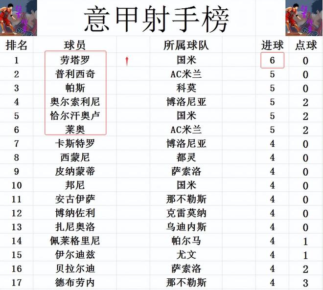 射手榜方面,终于是有人突破5球“大关”,劳塔罗昨晚梅开二度,超过普利西奇等人,6球登顶成功。普利西奇,帕斯,莱奥,恰尔汗奥卢和奥尔索里尼5球并列第2。西蒙尼,德布劳内,伊尔迪兹等人4球挤入前十。