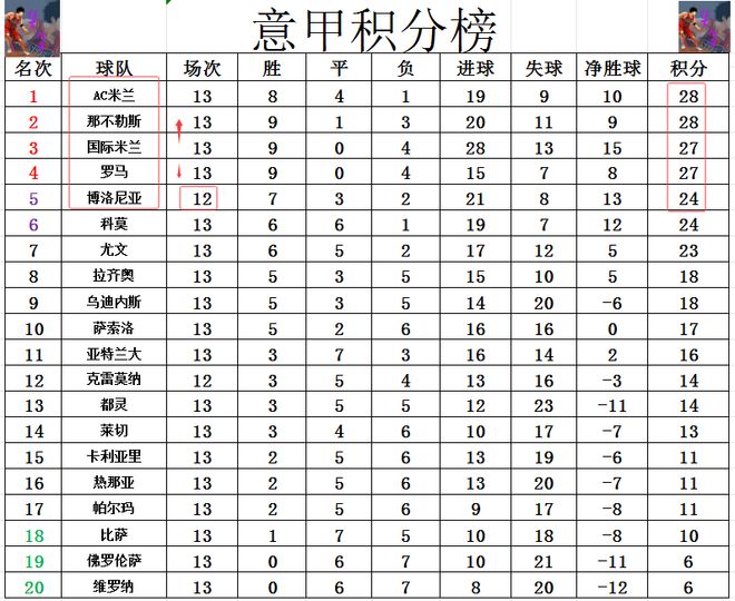 积分榜方面,那不勒斯击败罗马后,追上AC米兰,由于少了一个净胜球,那不勒斯就只能屈居第2。罗马就在榜首呆了一周,今天输球后,被国米追上,净胜球劣势的他们也就从上周的榜首一下跌到了第4,而且如果明天博洛尼亚赢球的话,他们排名还将继续下滑。意甲目前榜首的竞争比西甲还激烈,现在是4队分差就在1分之间。